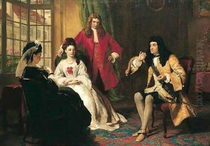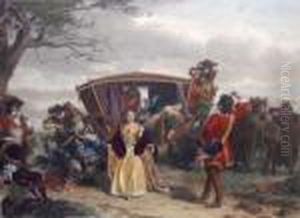 Scottish Scene Of A Man Inhelmet Wearing A Red Cape, Walking To A Woman At Center Inlong Spartan Shawl, Young Woman In Red And Black Shawl Toleft