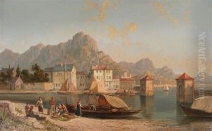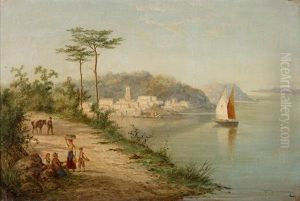 Mediterranean Scene With Figures And Fishing Boats Beside A Lake