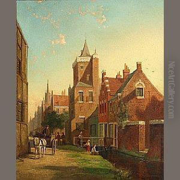 A Dutch Town Scene With A Figure And A Cart And Children Fishing From A Canal In The Foreground