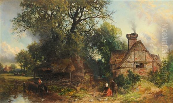 Figures Feeding Chickens Beside A Cottage