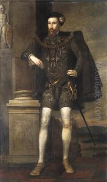 Portrait Of Henry Howard, Earl Of Surrey, Aged 29, Standing Fulllength, Wearing An Embroidered Costume, With A Dagger And A Sword,by A Pedestal