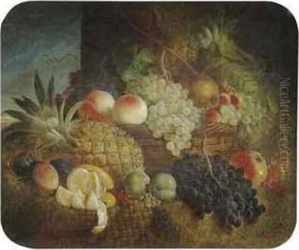 Pineapples, White Grapes, Black Grapes, Cherries, Peaches, Apples, Plums, White Currants, Red Currants, Strawberries, A Pear And An Orange, Arranged In Baskets On A Hay Stack