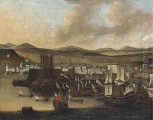 An Italianate Landscape With A Man O'war At Anchor In A Bay Beyond