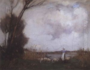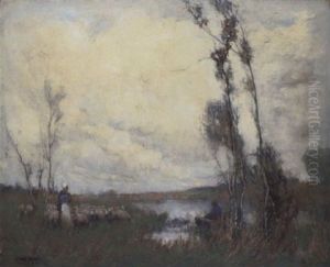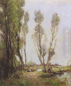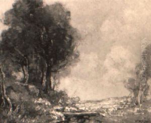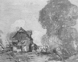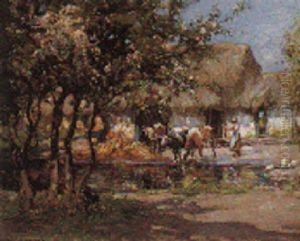 Cattle Watering At A Ford, Villagers On A Bridge Beyond