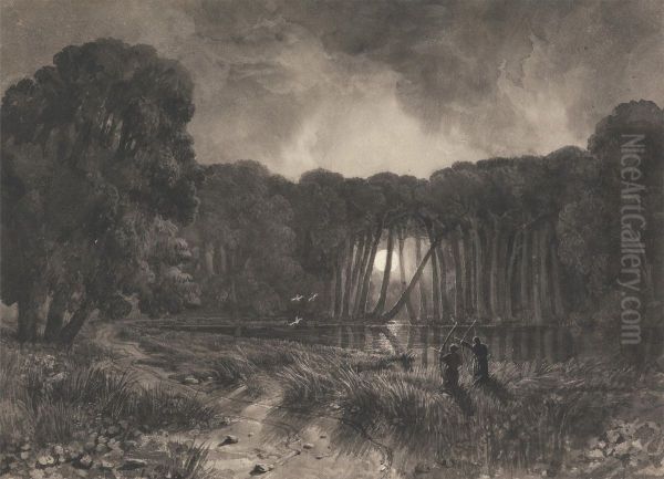 Bowmen at a Moonlit Lake Shooting Wildfowl
