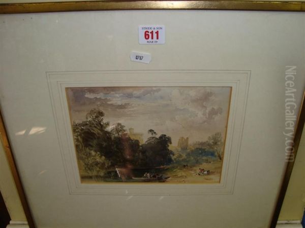 Figures In Punt On River With Figures On Bank At Windsor With Castle In Background