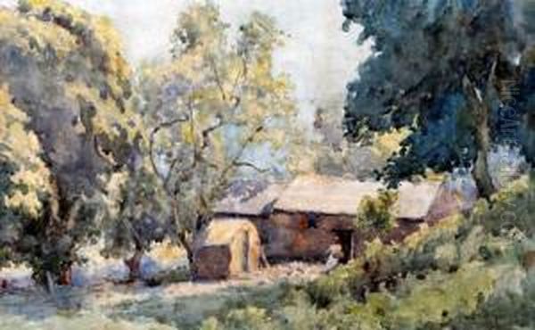 Feeding The Chickens, A Lady Before A Barn In Woodland
