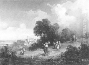 Landstrase Mit Fahrenden Schauspielern, Wachposten Und Spaziergangerm Oberhalb Eines Stadtchens