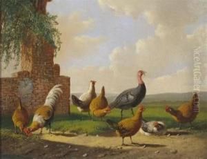 Huhner Und Truthahne Im Garten Beim Futtertrog.