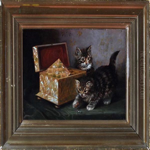 Two Kittens At Play Near A Mother-of-pearl Tea Caddy