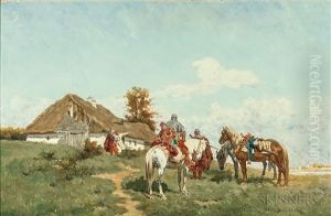 Polnische Vierspanner Mit Jagern, Im Vordergrund Eine Frau Zu Pferd