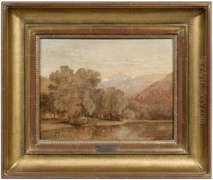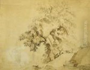 Un Paysage Boise Avec Des Personnages Lavant Du Linge Dans Unruisseau, Une Maison Dans Le Fond