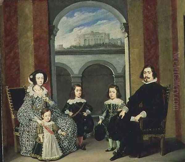 Francesco Tapia Conte del Vasto with his Family seated in an interior of the Palazzo Tapia with a View of the Castello di Sant Elmo