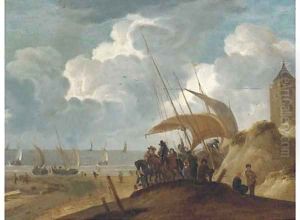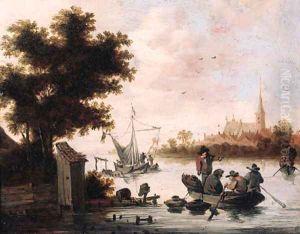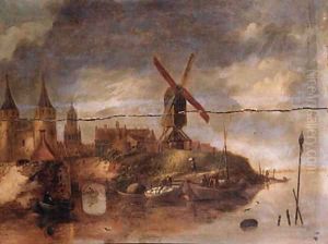 A river landscape with fishermen at a landing stage by a tower, sailing vessels beyond
