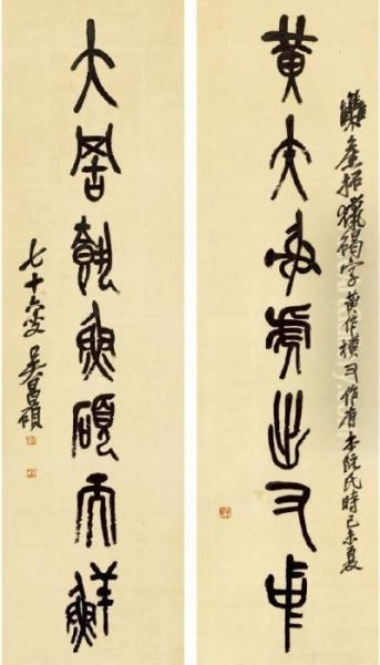 Bring the timeless beauty of Wu Changshuo's Calligraphy Couplet into your home with a handmade oil painting reproduction. Carefully recreated on canvas by skilled artists using traditional techniques, this piece captures the delicate brushwork, subtle light, and vibrant color of the original masterpiece. With museum-level quality and rich texture, it brings elegance and artistic depth to any space. Enjoy free shipping and make this masterpiece a part of your personal collection.