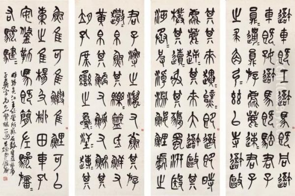 Bring the timeless beauty of Wu Changshuo's Calligraphy In Stone Drum Script into your home with a handmade oil painting reproduction. Carefully recreated on canvas by skilled artists using traditional techniques, this piece captures the delicate brushwork, subtle light, and vibrant color of the original masterpiece. With museum-level quality and rich texture, it brings elegance and artistic depth to any space. Enjoy free shipping and make this masterpiece a part of your personal collection.