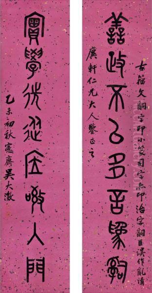Bring the timeless beauty of Wu Dacheng's Calligraphy Couplet In Zhuanshu into your home with a handmade oil painting reproduction. Carefully recreated on canvas by skilled artists using traditional techniques, this piece captures the delicate brushwork, subtle light, and vibrant color of the original masterpiece. With museum-level quality and rich texture, it brings elegance and artistic depth to any space. Enjoy free shipping and make this masterpiece a part of your personal collection.