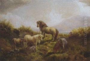 Sheep Grazing In A Meadow; And Horses Beside A Stream In A Moorlandlandscape