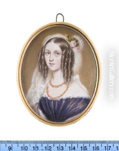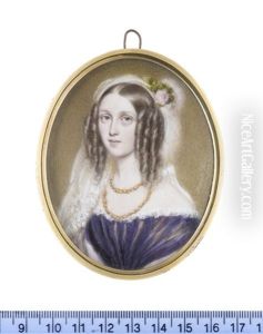 Portrait Of A Lady, Half-Length, In A Black Dress With White Lace Trim, Holding A Pocket Watch In Her Left Hand