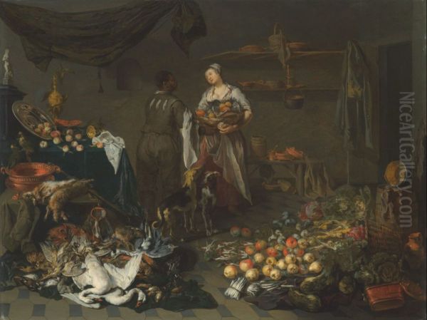 Kitchen interior with a maid and a servant conversing, with an abundance of game, fruit and vegetables