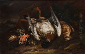 Still life with grapes in a porcelain dish and peaches on a tazza, with melons and snails