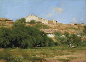 A young woman wearing a straw hat and holding a hen and a basket of eggs