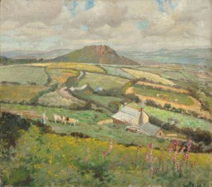 A split melon, peaches, plums, grapes, apples and currants with a parrot and a bullfinch, a mountainous landscape beyond