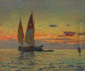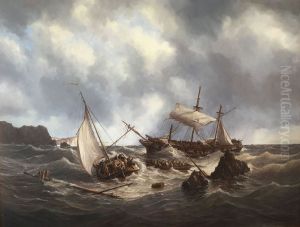 A British '74' unfurling its sails as it prepares to leave the anchorage with a frigate and various coastal craft beyond
