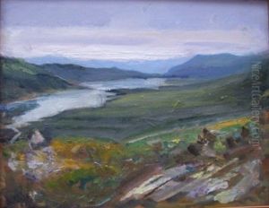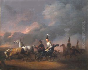 Hirte mit Hund und weidenden Pferden in Landschaft