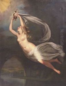 Ein eine in den Wolken schwebende Frau zartlich kussender Putto.